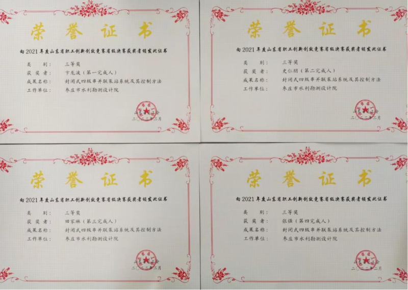 为响应省“十大创新”号召,进一步落实我市“工业强市、产业兴市”战略,集团公司积极树立“创新为先”的理念,结合新形势、新要求,引燃职工的创新创效热情,全员性的创新创效结出了累累硕果。在“2021年山东省职工创新创效竞赛省级决赛”中,集团公司职工史仁朋、卞龙波、田家琳和张强同志设计的滕州南水北调项目,荣获三等奖,得到了省专家组的一致好评。有力的展现了集团职工刻苦钻研、灵活创新,迎难而上解决水利工程难题的精神风貌。