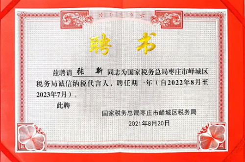 山东鸿运水利工程有限公司已连续两年获得纳税信用AAA级纳税人的光荣称号,作为优化营商环境,诚实守信的企业代表,为峄城区的经济发展贡献了一定的力量。国家税务总局枣庄市峄城区税务局特聘请张新同志为国家税务总局枣庄市峄城区税务局诚信纳税代言人。