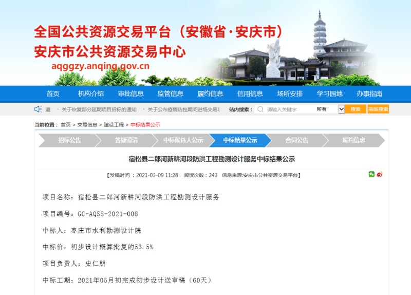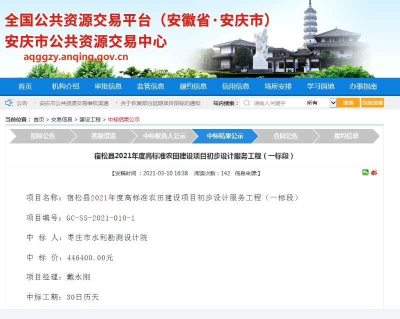 2021年3月10日,全国公共资源交易平台上公示了枣庄市水利勘测院投标的2个项目,目前已过公示期,这标志着枣庄市水利勘测设计院安徽分院投标的2个项目已经中标!